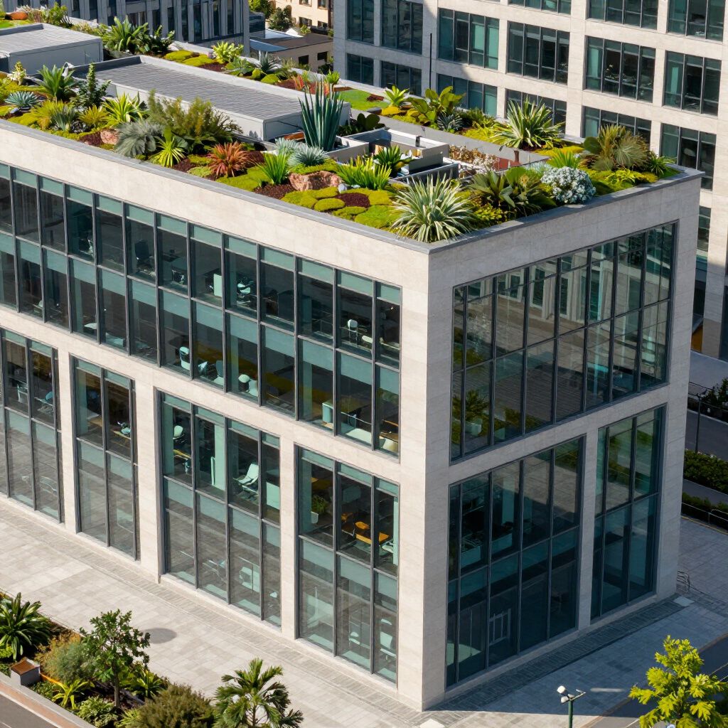 Modernisering van het kantoorpand met duurzame materialen en energiebesparende installaties voor een lagere energierekening.